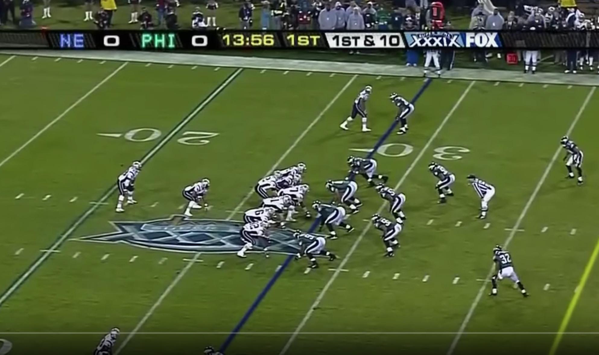 But much of this game looked different from the football we see today. The first thing that stands out is how much the league’s most-utilized schemes and formations have changed in the past 13 years. The I-formation—a look that features two backs lined up behind the quarterback, who took the snap from under center—was ubiquitous in 2004. And sure enough, on the Patriots’ first two plays, New England lined up like this: