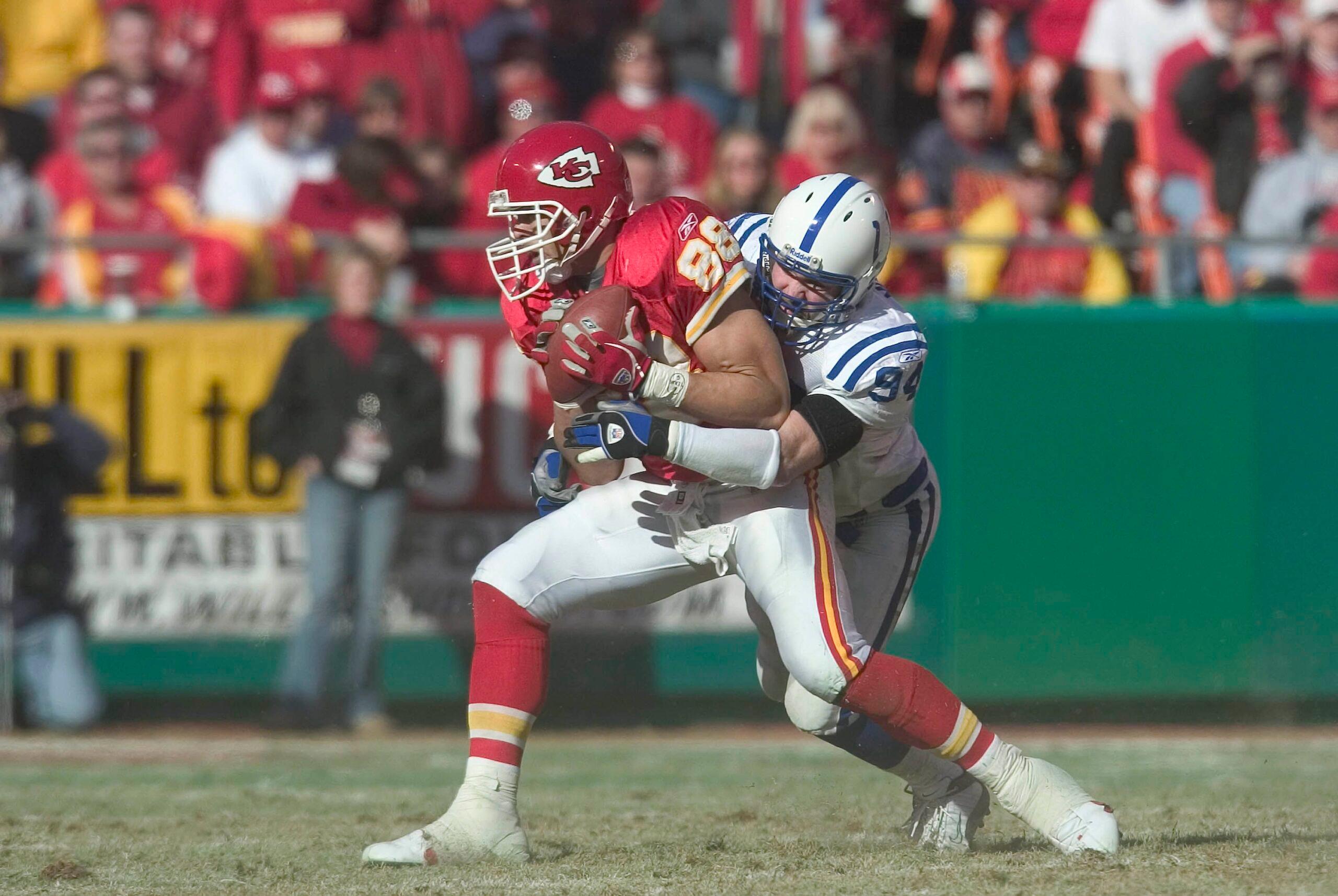 I am 28 years old, having settled in the Chicago suburbs for good, newly minted as both a board-certified dermatologist and as a father, and the 2003 Chiefs are back in the playoffs for the first time in six years. They have a new identity now; the suffocating defense of MartyBall has been replaced by head coach Dick Vermeil’s high-flying offense, and the Chiefs score a then-franchise-record 484 points. Priest Holmes rushes for 27 touchdowns to set the single-season NFL record; Gonzalez is in his prime; Dante Hall is the X factor; and Trent Green, flanked by the best offensive line I have ever seen, is one of the game’s most productive quarterbacks. None of those guys play defense, though. The Chiefs go 13-3 again, get a first-round bye again, and face the Colts again. Only these aren’t the plucky 9-7-and-led-by–Jim Harbaugh Colts. These are the Peyton Manning Colts, and Peyton Manning is terrifying even when your defense is good. The Chiefs defense isn’t good. The Chiefs don’t punt during the entire game, but neither do the Colts. The difference is that Holmes fumbles at the end of a long run, and the Chiefs’ new kicker—the legendary Morten Andersen—misses an easy field goal just because. Indy wins 38-31. Defensive coordinator Greg Robinson is let go two days after the game. It is too late.