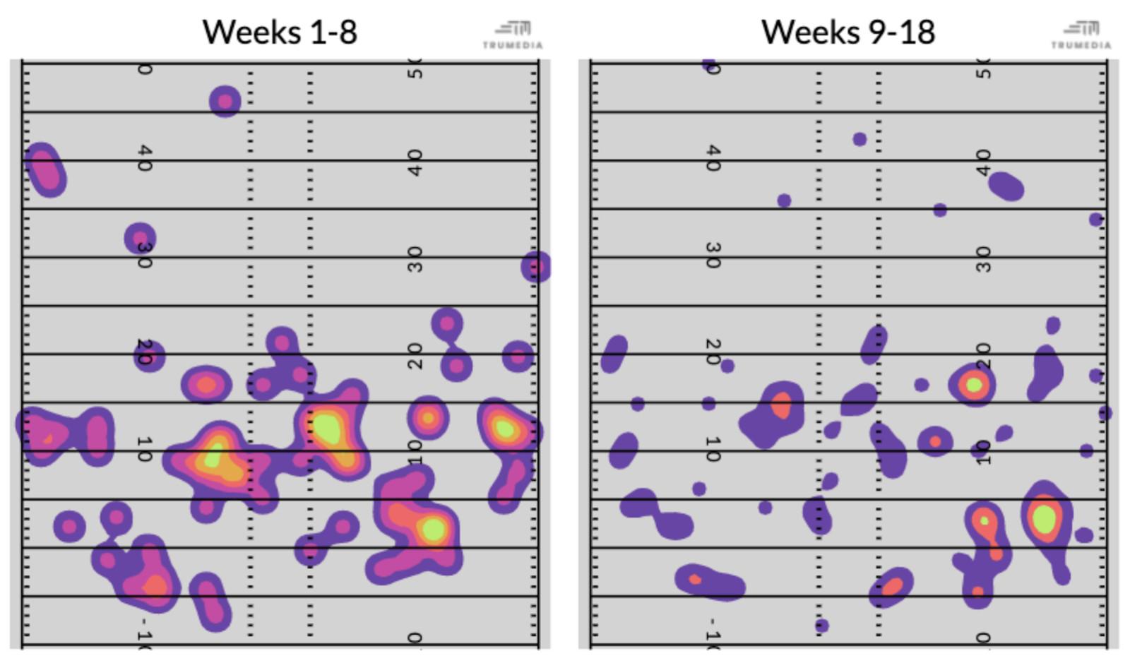 It’s impossible to say that Henry’s presence in the backfield makes Tennessee’s play-action passes—which have fueled the passing game since Tannehill took over as QB—any better. There are too many factors there that we can’t account for. But we can say that the team’s play-action game was better when he was on the field. And we can also say why that was the case: Tannehill was able to target the middle of the field more often when Henry was healthy, as you can see in his passing heat map on play-action attempts, via TruMedia: