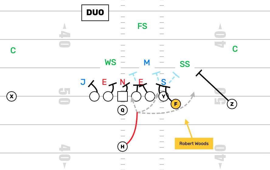 For duo to work, the Rams need to add additional blockers to the strong side of the formation. They could do that with multiple tight ends, but this team was built to live in 11 personnel. So they instead asked Woods to attach himself to the formation and dig out strong safeties as a blocking receiver, and Woods quickly became renowned as one of the best blocking receivers in the league.