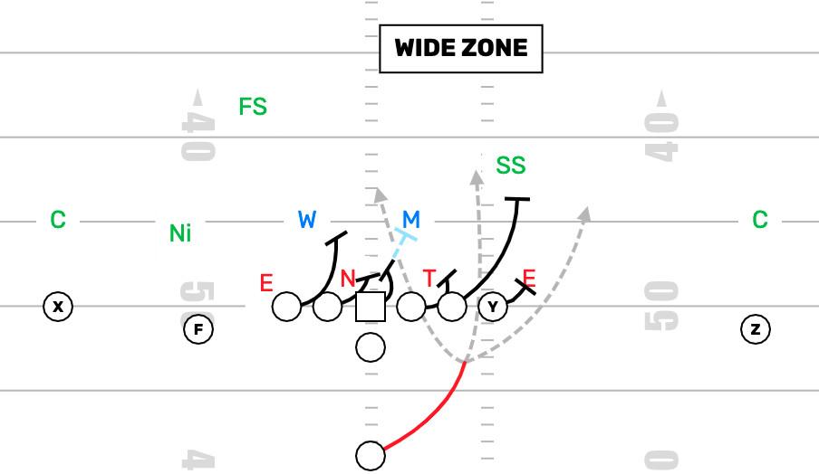 It is important to define what exactly Shanahan and McVay shared when they took their respective jobs. At the core of their offenses is the wide zone running play. Wide zone refers to the blocking of the offensive line, as well as the path of the running back. On a wide zone run, each offensive lineman steps in the same direction and explodes horizontally, looking to get to the play side of each opposing defensive lineman and linebacker. This forces a strong flow from the defense: Defensive linebackers and linemen must race to beat offensive linemen to their marks. As the defense flows, the running back is able to pick the best running lane and cut upfield to punish the defense for flowing too aggressively with the offensive line.