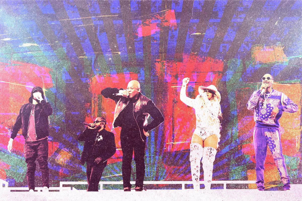 It’s awfully tempting to start with Mary J. Blige, who killed more of it than anybody, but no, let’s take this in chronological order. Dr. Dre was the official headliner of the Super Bowl LVI halftime show, and he emerged onstage at SoFi Stadium—out in Inglewood, always up to no good—as a conquering hometown (well, close enough) hero awkwardly adjusting his stage outfit from behind a colossal white spaceship mixing board that probably didn’t do anything other than look cool, which was all it had to do. His stage set was an opulent moon colony’s worth of futuristic white boxes housing a full band, an ebullient crew of dancers, and various lowriders to help get everyone off the field afterward; his first superstar guest, of course, was Snoop Dogg, and quickly we moved from “The Next Episode” to “California Love,” where what Dre did (rap the line “Pack a vest for your jimmy in the city of sex” in full with an endearing stiffness) is less important than what he didn’t do. (No Tupac hologram. I can’t express to you how relieved I am about this.)
