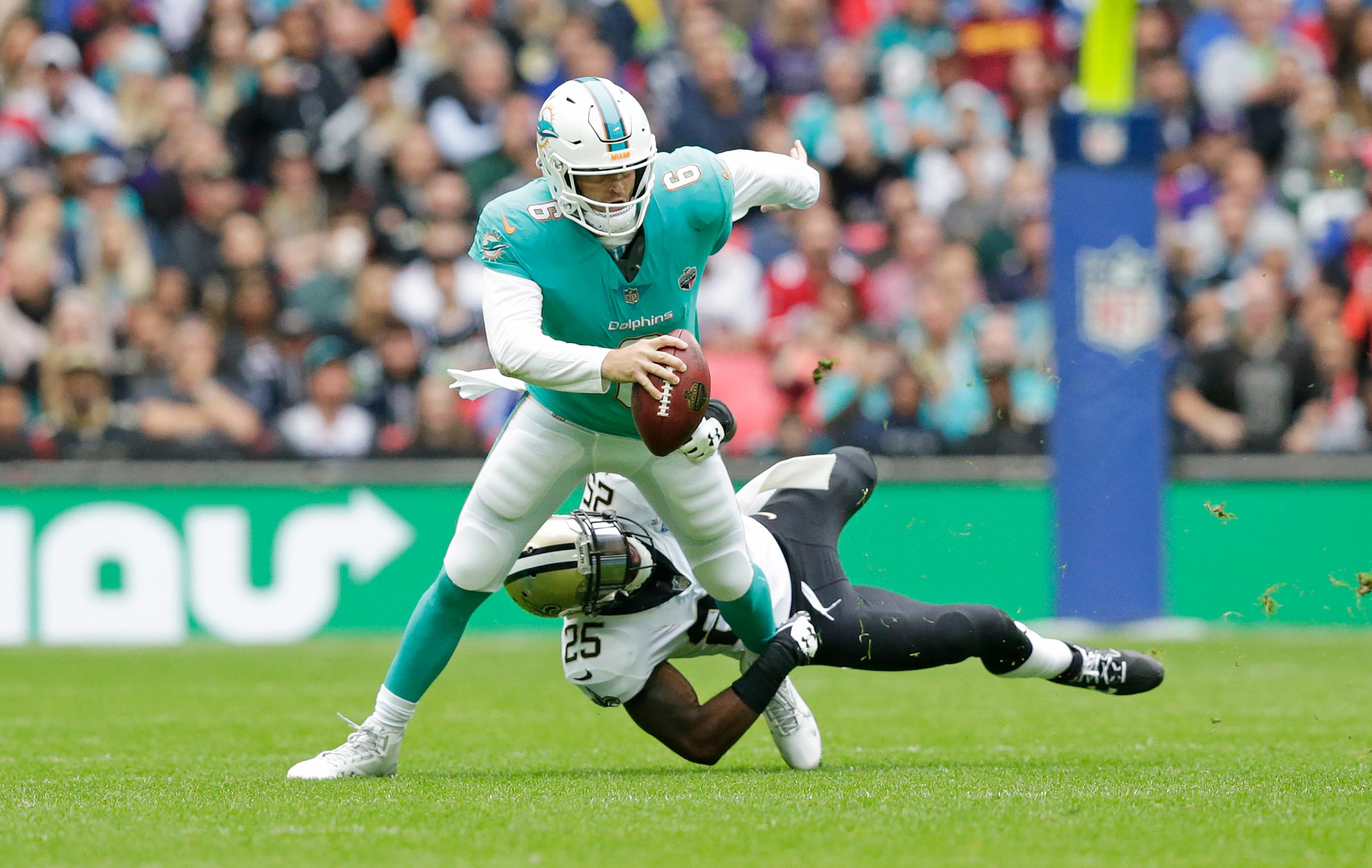 Cutler started Sunday’s Miami–New Orleans game in London on a 12-play, 81-yard drive where he went six-of-seven passing and Miami picked up six first downs. As the Dolphins stood at the Saints’ 4-yard line on a first-and-goal, Cutler looked every bit the season savior he was billed to be when Miami signed him to replace Ryan Tannehill after Tannehill injured his knee in early August. But the mirage didn’t last long, as Cutler’s first-down pass was intercepted in the end zone.