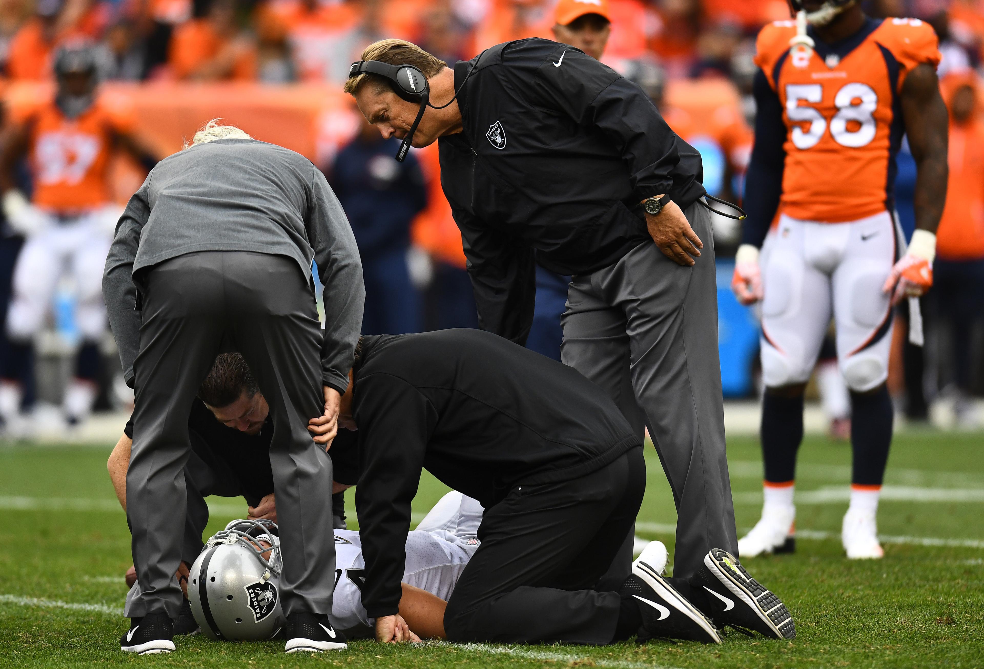Franchise quarterback Derek Carr has a fracture in his back and will miss two to six weeks, according to Raiders head coach Jack Del Rio. Carr was scrambling in the backfield trying to avoid a sack from multiple Broncos defenders when, falling toward the ground, it appeared he took a knee in the back from Broncos defensive end Adam Gotsis. Carr stayed down on the field before heading to the blue medical tent on the sideline, and eventually the locker room.