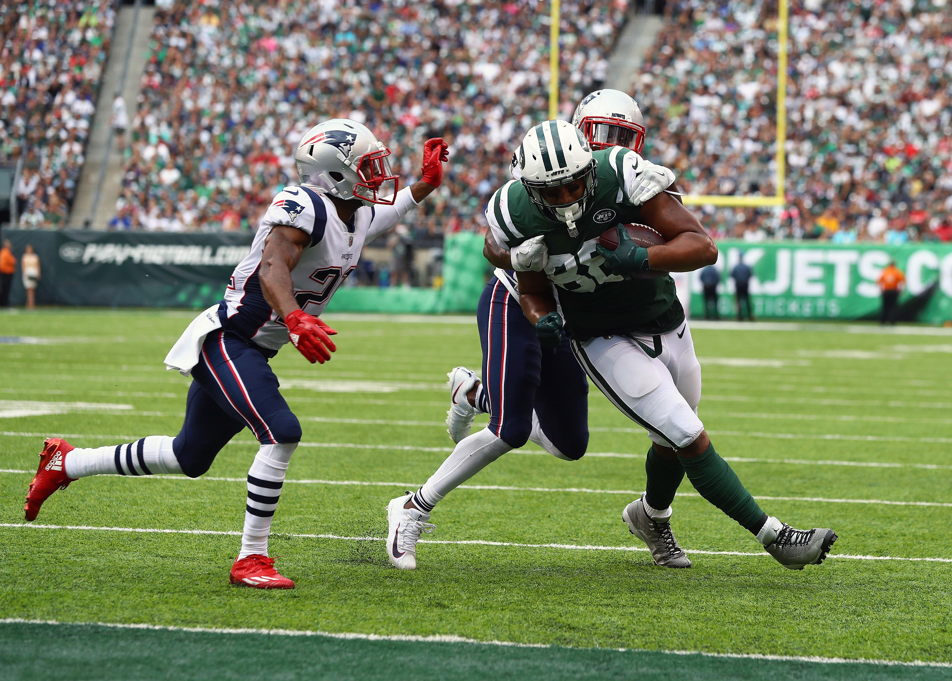 Initially, it was ruled that Jets tight end Austin Seferian-Jenkins had scored a touchdown. Some Patriots tried to argue with officials that Seferian-Jenkins had been short of the end zone. But they did not appear to be telling the officials that the tight end fumbled the ball. Nobody watching the play live would have argued for that ruling. But after reviewing the play, officials determined the play resulted in a fumble out of the end zone, which gave possession to the Patriots. A Jets touchdown had become a Jets turnover.