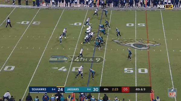The Jags have a league-leading 47 sacks for a reason. Their nickel pass-rush package is downright terrifying, and being able to line Campbell up inside is a big reason. The 300-pound defensive end represents a mismatch for opposing guards, and the move he threw on Seattle left guard Luke Joeckel on a key fourth down reinforced that. Campbell’s burst allows him to beat Joeckel off the snap, and he finishes the play with a quick arm-over move that allows him to shoot into the backfield. That combination of quickness and length is too much for most interior offensive linemen, and this time it ends with Campbell crunching Russell Wilson and forcing an incompletion.