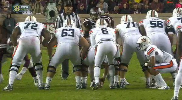 The guy crouching in the above photograph is Ryan Davis, who at 5-foot-9 and 164 pounds was the fourth-shortest and second-lightest player on Auburn’s 2015 roster. He was even smaller than the Tigers kickers, and can be seen here squatting behind three offensive linemen, all of whom are at least 6-foot-5 and 285 pounds. Normally, linemen maintain a crouched stance before the snap in an attempt to keep a lower center of gravity than any oncoming pass rushers; normally, a Malzahn-coached offense would feature linemen positioned reasonably far apart from one another in order to best execute a spread scheme. In this case, though, five linemen stood shoulder-to-shoulder as tall as they could, the center bent over to snap the ball, and 6-foot-5 quarterback Jeremy Johnson stood directly behind.