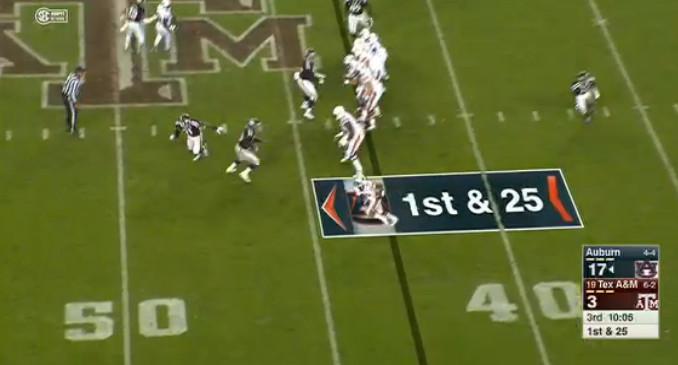 Look at this screengrab. There’s a Texas A&M player still trying to peek over the wall even as Davis bolts past the line of scrimmage.