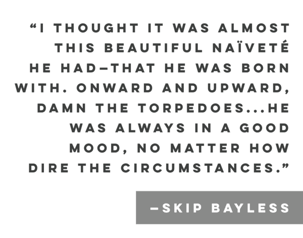 Jones has a weirdly optimistic quality about him. “I thought it was almost this beautiful naïveté he had—that he was born with,” Skip Bayless said. “Onward and upward, damn the torpedoes. … He was always in a good mood, no matter how dire the circumstances.” It was almost like an oilman’s ability to shrug and move on from a dry hole.