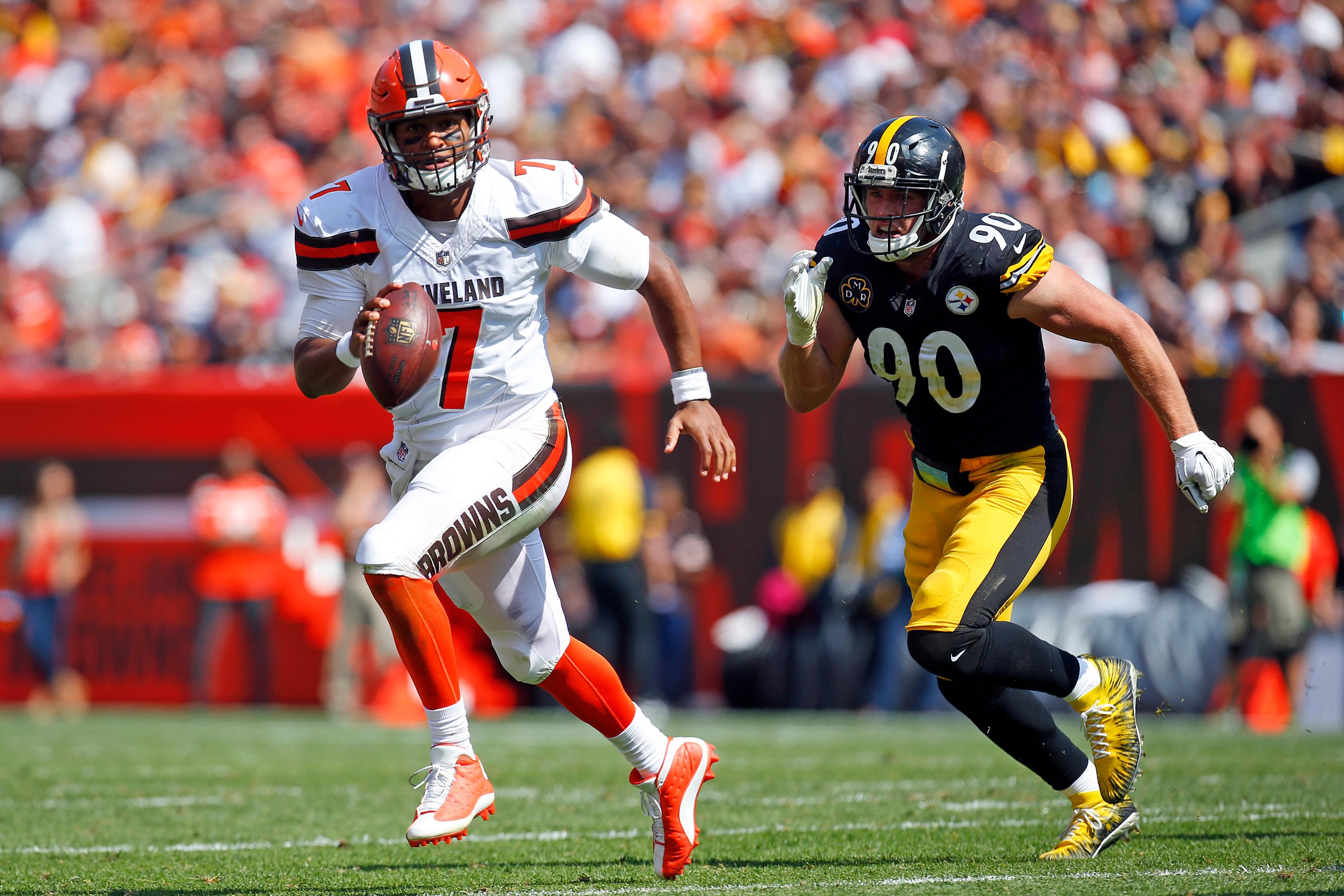 And then, just before the season began, he suffered a high ankle sprain in practice, which will likely sideline him for four to six weeks. Now there’s an opening for the league’s most exciting rookie defender, and on Sunday the Browns got a front-row look at a contender for that honor: T.J. Watt, the Steelers’ first-round pick and the younger brother of Texans superstar J.J. Watt. Watt wasn’t quite the world-beater that Garrett was in college, but his junior year with Wisconsin was a revelation, as he racked up 11.5 sacks, most in the Big Ten. In Cleveland on Sunday, J.J.’s younger brother picked up two sacks and six tackles to go along with something even more prized: an interception.