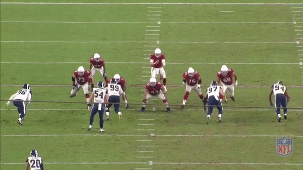 In a sense, Donald’s unpredictability on the field can make him a coaching challenge. “You wouldn’t let anyone else do that,” Johnson says of Donald’s freelancing tendencies. He points to a game-sealing sack from the Rams’ 41-39 win against the 49ers in Week 3, one of those classic plays that involved Donald hopping from one gap into the other, as evidence. At the snap, Donald goes after right guard Brandon Fusco’s outside edge with a quick club-and-rip move. The moment that Fusco leans to his right to slow him, though, Donald swings his left arm over the guard’s hands, bursts inside, and drags quarterback Brian Hoyer down in the backfield.
