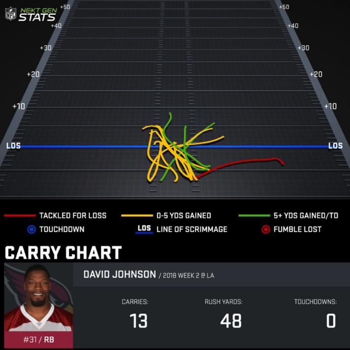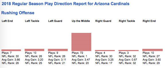 As for the ground game, Johnson has failed to find his footing there, too, on pace for just 792 yards on the year. Part of the problem there is that the basic plan seems to be to smash Johnson right into the meat of the defense over and over and over again. The Cardinals are 29th in total rush attempts, yet rank first in rush attempts right up the middle per NFL GSIS tracking (63 percent of their total run plays, a huge jump from the 42 percent rate in 2016).