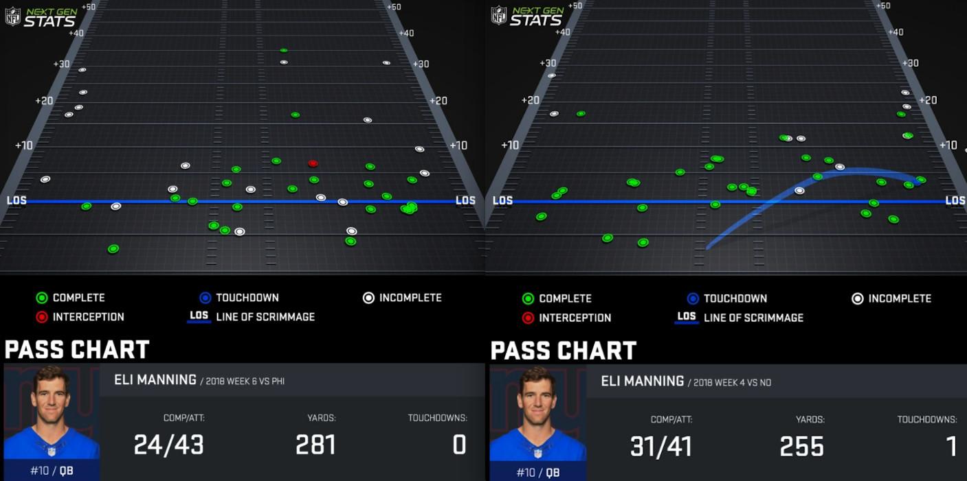 Giants head coach and play-caller Pat Shurmur must unlock deeper-developing routes for Beckham (and the team’s other receivers). Hell, he needs to figure out how to get more out of Beckham on intermediate passes, too. The lack of protection from the offensive line has been a problem, but the heavy doses of play-action passes that I expected when Shurmur made the move from Minnesota to New York (and which we saw in the preseason) haven’t materialized. Those plays are designed to deceive defenses, get them out of position, and take advantage of overzealous linebackers geared up to stop running back Saquon Barkley. But Manning has thrown off play-action just 18.2 percent of the time (27th), per PFF, and hasn’t fared well, completing 60 percent of his passes for 338 yards, one touchdown, and two picks.