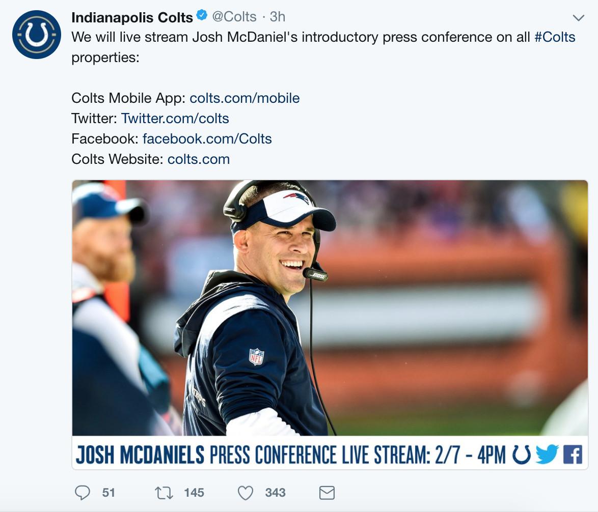 On Tuesday morning, the Colts announced they were hiring Patriots offensive coordinator Josh McDaniels to be their next head coach.