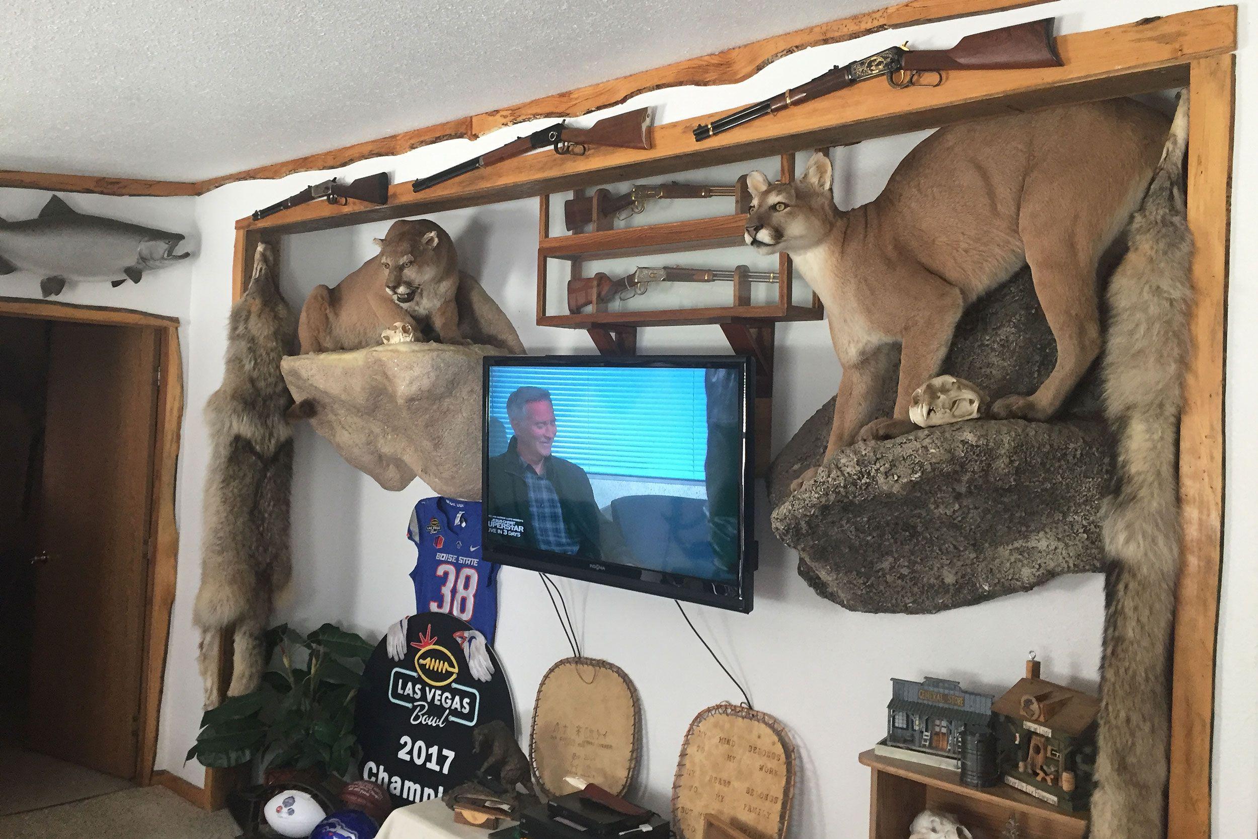 The living room contains just a fraction of the family’s animal mounts. Three taxidermied deer heads share a wall with a king salmon that Vander Esch’s mother caught in Alaska. A pair of mountain lions flank the TV, stalking whoever is parked on the couch. And above the sofa, on a wall of its own, hangs a framed photo of Leighton from last season’s Las Vegas Bowl, when Boise State took on Oregon. As Harsin considers Vander Esch’s college career, it’s the first thing that he mentions.