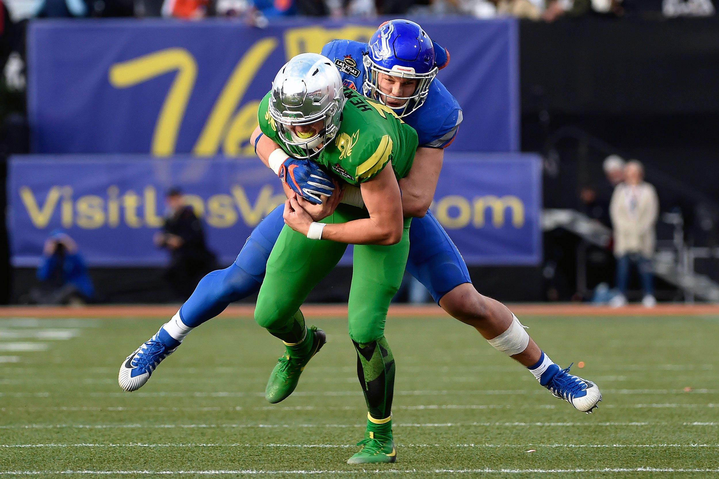 Late in the first quarter, the Ducks threw a swing pass into the flat for speedy running back Tony Brooks-James. Vander Esch not only tracked down the smaller back in space; he lifted Brooks-James into the air, knocking the ball loose and allowing Boise State to recover. The forced fumble was one of Vander Esch’s three tackles for loss on the day. He built a home in the Oregon backfield and refused to leave. The Broncos won, 38-28.