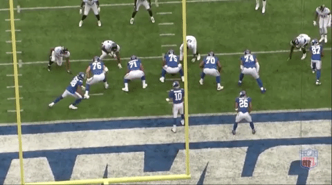 In the third quarter, the Giants had a similar issue when facing a second-and-10 from the Jaguars’ 33-yard line. After motioning across the formation, Ellison initially engages with Solder to block Lerentee McCray before breaking off to clock safety Tashaun Gipson. The only problem is that Solder broke off at the same time to deal with linebacker Telvin Smith, leaving McCray free to smack Barkley in the backfield. Barkley somehow managed to shrug off a tackle, bounce to his right, and still rush for a 4-yard gain (though that was later called back on a holding penalty).