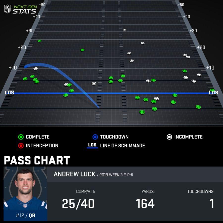 In the Colts’ 20-16 loss to the Eagles, Luck completed 25 of 40 passes for 164 yards (4.1 yards per attempt) and one touchdown. That wasn’t much different than what we saw in weeks 1 and 2, and, on the year, Luck’s average intended air yards sit at 5.5 per throw, the second shortest leaguewide, while his average completed air yards per throw (3.4) is tied for the NFL low. Here’s what that pass offense looked like Sunday, from NFL Next Gen Stats: