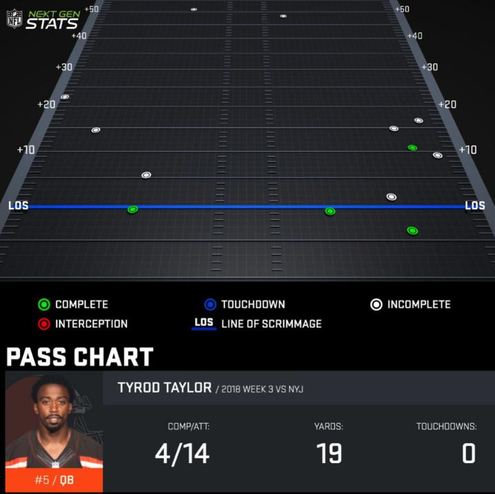 A week full of first-team reps should improve chemistry and timing between Mayfield and his top weapons, and his accurate, high-velocity throws could open things up for Cleveland’s offense. The former Sooner showed no hesitation to attack the intermediate and deep areas of the middle of the field, something that Taylor avoided both in that game and for much of the first two weeks (and most of last year for the Bills). Here’s Taylor’s passing chart from Thursday, via NFL Next Gen Stats:
