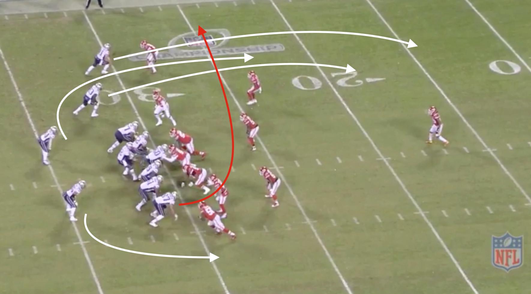 Together with offensive coordinator Josh McDaniels, grizzled offensive line coach Dante Scarnecchia has helped design a diverse, tough-to-defend run scheme. The Pats dug deep into their playbook in the championship round, throwing everything but the kitchen sink at the Chiefs’ oft-overwhelmed front. New England’s 15-play, 80-yard opening drive was the perfect microcosm for how they’ve utilized a wide variety of runs out of multiple personnel groups to confuse and disorient their opponents. As NFL Films maven Greg Cosell detailed on The Ross Tucker Football Podcast last week, the team’s seven first-down run concepts on that opening drive went in this order: an iso lead weak run out of 21 personnel (two running backs, one tight end), a counter run out of 22 personnel (two running backs, two tight ends), an outside zone run out of 22 personnel, an iso lead strong run out of 21 personnel, a zone counter run out of 11 personnel (one back, one tight end), an inside zone lead run out of 21 personnel, and an outside zone run out of 11 personnel. That’s just one possession, and only the first-down runs. Just take a look at the variation in how these plays started; in blocking, formation, personnel, run direction, and even Brady’s footwork.