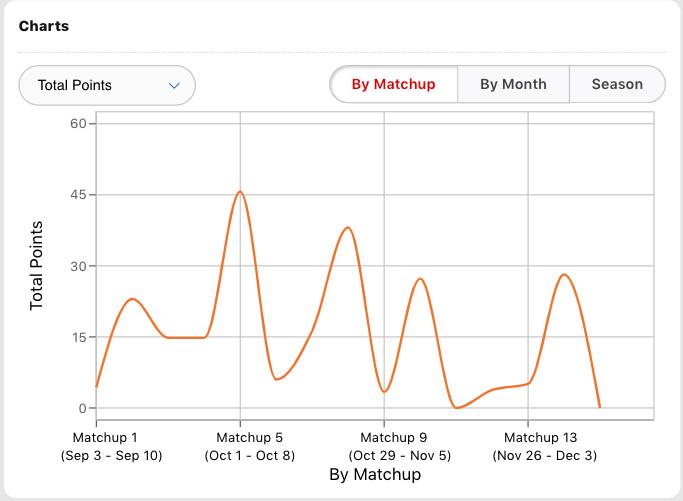 ESPN’s fantasy site has this neat feature where it charts a player’s fantasy points each week. Here is what Aaron Jones’s chart looks like.