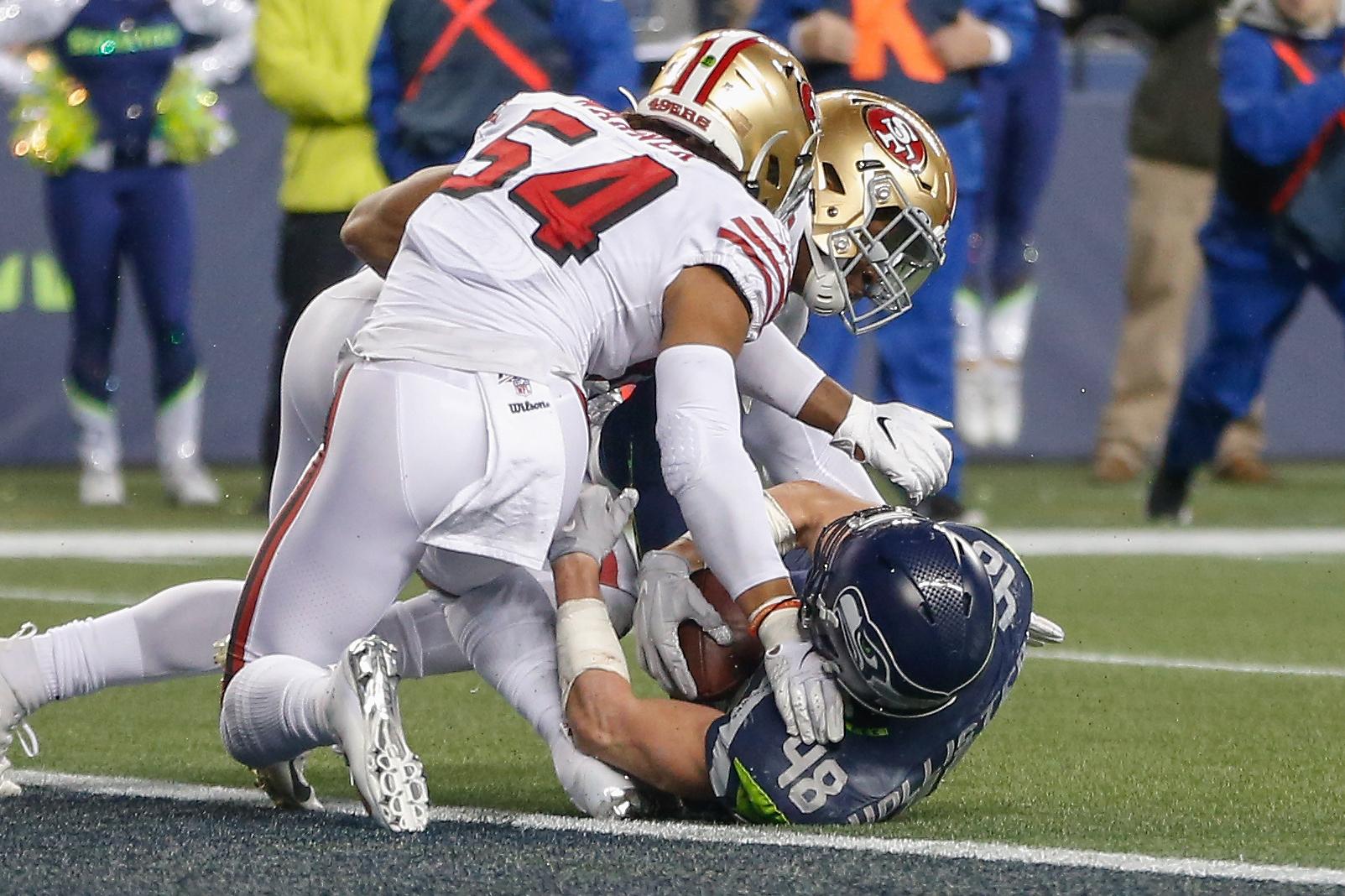 Wilson couldn’t connect on second or third down (to be fair, that latter play looked like a missed defensive-pass interference). On the subsequent fourth-and-the-season from the 5, Wilson found tight end Jacob Hollister in nearly the exact same place as he found Ursua … and Hollister was also short, this time by just inches after an incredible tackle by rookie linebacker Dre Greenlaw.