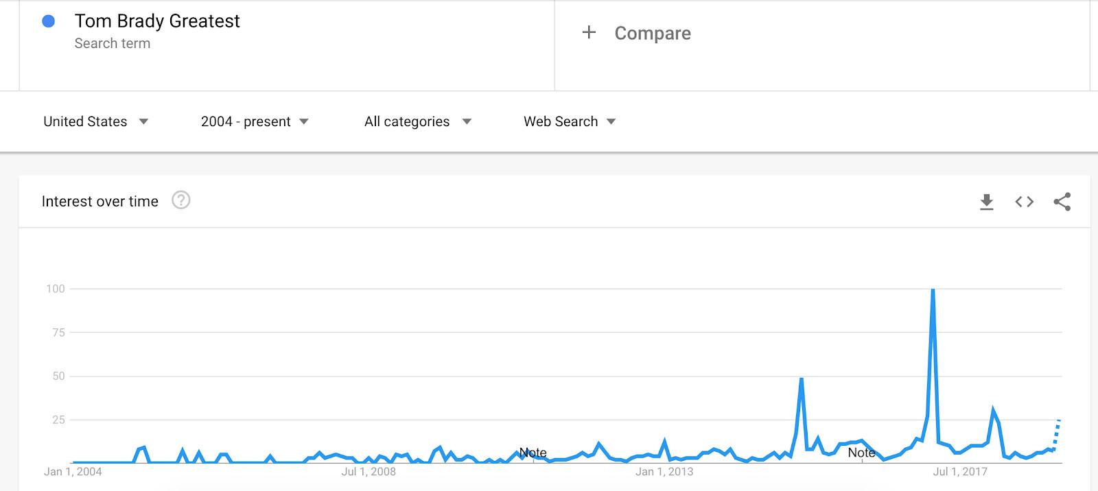 None of this happened, obviously. Instead, the case for Brady as the greatest quarterback of all time picked up more steam than ever before. Here’s a Google Trends chart for “Tom Brady Greatest.”