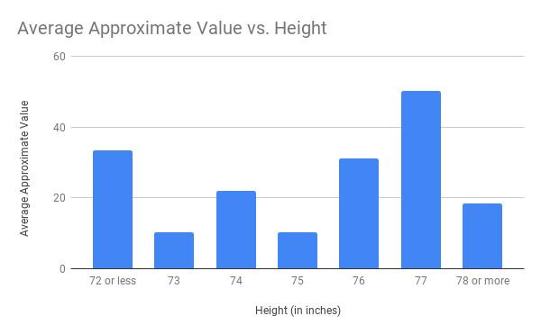 My first takeaway: 6-foot-5 has been the most successful quarterback height. Sixteen QBs who entered the league this century have surpassed 100 career AV, and six of them (Philip Rivers, Ben Roethlisberger, Matt Ryan, Eli Manning, Carson Palmer, and Cam Newton) are exactly 6-foot-5. Peyton Manning, the all-time career leader in AV, is also 6-foot-5, but isn’t represented on this scatterplot because he was drafted in 1998.