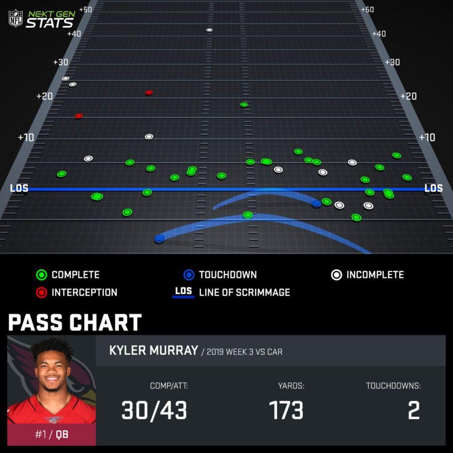 That progress came to a screeching halt in the team’s 38-20 Week 3 loss to the Panthers. Murray completed 30 of 43 passes with two touchdowns and two picks—but those 43 throws produced just 173 yards, a pathetic 4.0 yard per attempt average. His pass chart does a good job of illustrating how that happened: