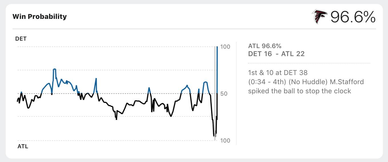 By this point, it’s become clear that ESPN’s win-probability model is a bit broken, but let’s take a look at it anyway. As Stafford was driving in the fourth quarter, the Falcons had a 96.6 percent chance of winning the game, making this the team’s third collapse of the season with a win probability of 95 percent or higher. In one game, they lost after achieving a 99.9 percent win probability.