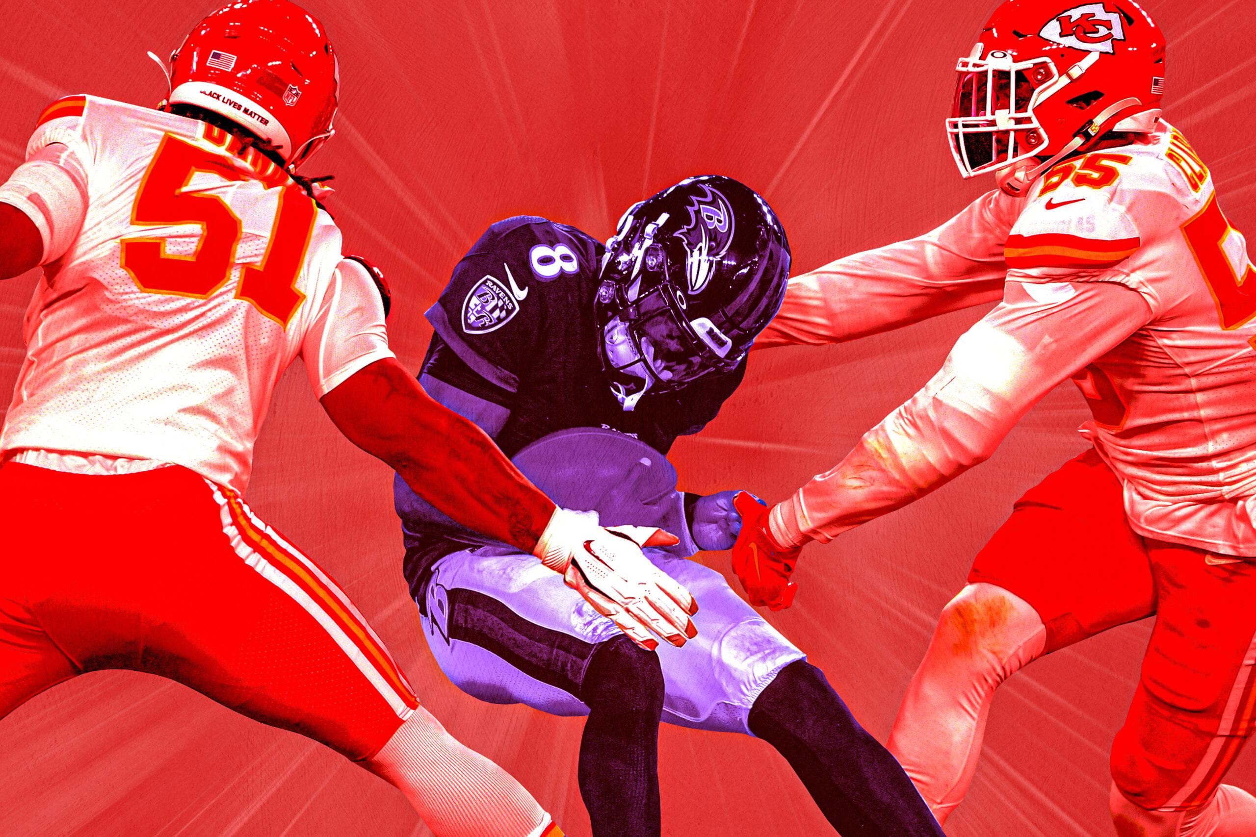 To prepare for Jackson, the Chiefs brought in free-agent quarterback Jordan Ta’amu, who most recently played for the XFL’s St. Louis BattleHawks, to mimic him on the scout team. It’s an exercise often undertaken by Ravens opponents that usually only reinforces the fact that there are very few Lamar Jacksons. At the very least, defensive coordinator Steve Spagnuolo had a clear plan: He wanted to cover the middle of the field and force Jackson to make throws to the outside without losing containment. It would require discipline from the Chiefs’ defensive linemen—let Jackson get beyond the first level of defense, and there’s no guarantee players in the secondary will be able to catch him.