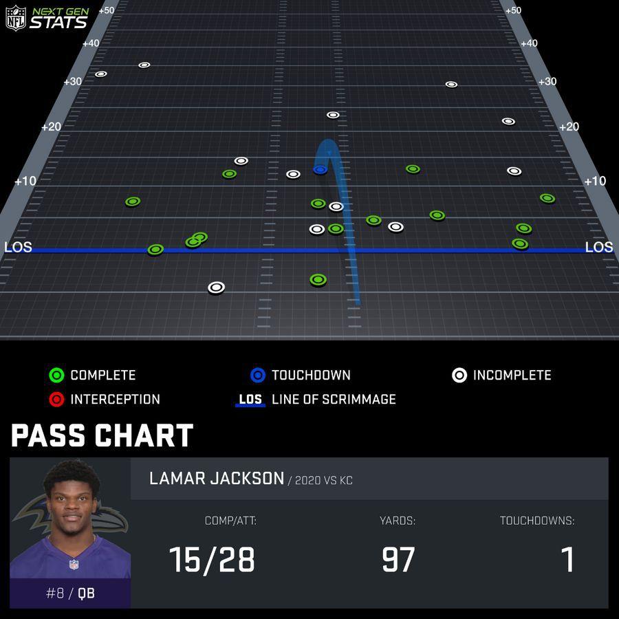 The Chiefs were effective at taking away Jackson’s throws over the middle of the field. His threat as a runner typically opens up that area when the Ravens are clicking, but Jackson’s passing chart shows he didn’t have a lot of success there. Most of his deep passing attempts, especially, were toward either sideline.
