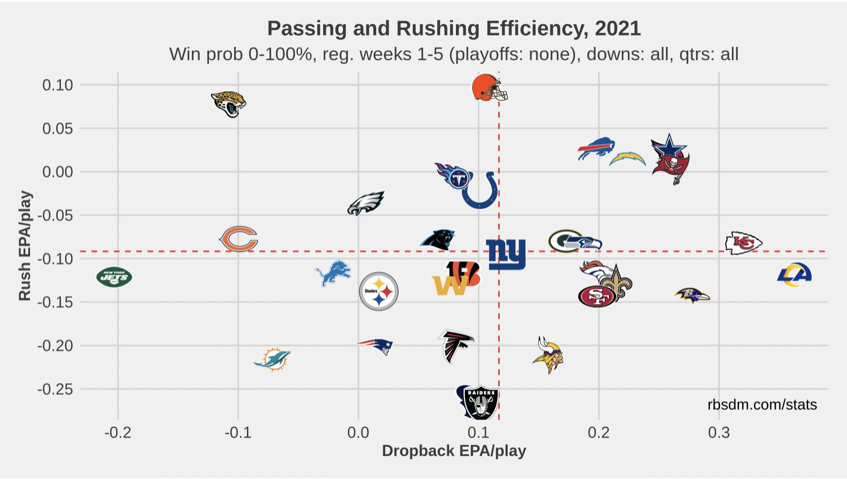 In fairness, Mayfield is playing through a partially torn labrum in his left shoulder. The fourth-year pro completed 23 of 32 passes for 305 yards and two touchdowns against the Chargers. He hasn’t thrown an interception since Week 2 and is averaging 8.6 yards per attempt (which would be a career high), and ranks ninth in completion percentage over expected (plus–3.5 percent), per Next Gen Stats. His average depth of target through five games is 9.6, more than a full yard over his average the previous two seasons. However, his completed air yards per attempt of 5.8 is on pace to mark a new career low—he’s just not completing many of his downfield attempts. The Browns are tied for 10th in explosive pass rate, and Mayfield is middle-of-the-pack in terms of EPA per play (0.138), according to Ben Baldwin’s database.