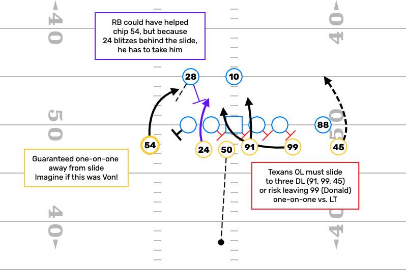 Von is a force multiplier in these contexts. He’s a devastating individual rusher, so the presence of Donald should help him see more one-on-ones, which he will win even more often than Floyd. But Von is such a dangerous rusher that chip help from tight ends and running backs releasing in routes will likely go to him, which should provide easier wins for Floyd on the other side. On passing downs, the Rams can now twist and stunt not just with Donald and Floyd, but with Donald and Von from standard fronts; in funky fronts, they can place Floyd as a stand-up interior rush with Von on the same side of the formation, while leaving Donald isolated on the opposite side. Von, like Floyd, is a devastating crasher on stunts because of his velocity and physicality—and when he knifes into those interior gaps, he has the bend to flatten his rush and still get to the quarterback.