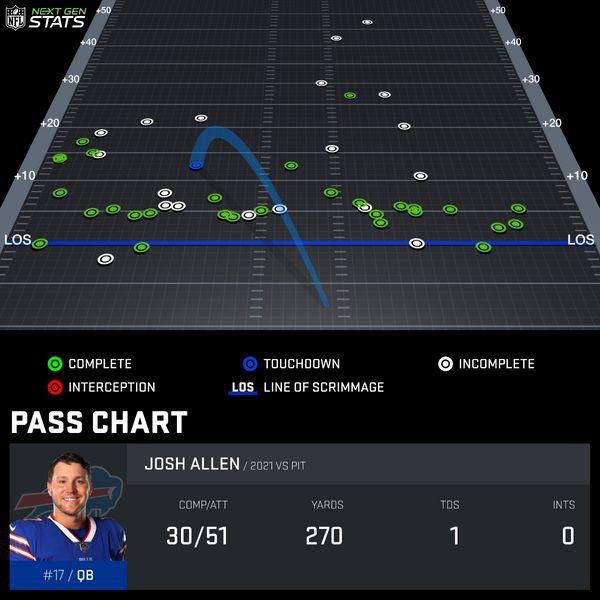 The Bills star tried his best to pierce some of those tight, downfield windows, but he often had to settle for shorter passes to find completions. Allen finished the game with the week’s fourth-highest average depth of target (9.7 yards), but his average depth of completion (6.5) ranked 15th, per Next Gen Stats. Only two quarterbacks had a wider margin that week, and the discrepancy shows up on his passing chart.
