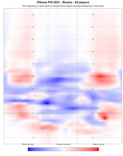 This is most clearly reflected in Hurts’s passing distribution. Sports Info Solutions credits Hurts with only 28 passing attempts this season in the intermediate middle of the field, which is 26th in the league; only 60 percent of those attempts had a positive EPA. PFF can generate a heat map for all of a quarterback’s targets relative to other league passers and show the areas of the field they favor and avoid—Hurts avoids the area between the hashes like the plague.