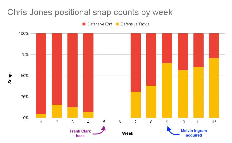 Jones missed Weeks 5 and 6—two more terrible weeks for the Chiefs’ defense—before returning in Week 7, with Clark active as well. The snaps started to level out, especially when Ingram was added in Week 9. Suddenly, Jones returned back to his traditional career distribution of snaps: a sprinkling of reps as a big defensive end, but a majority of reps at defensive tackle.