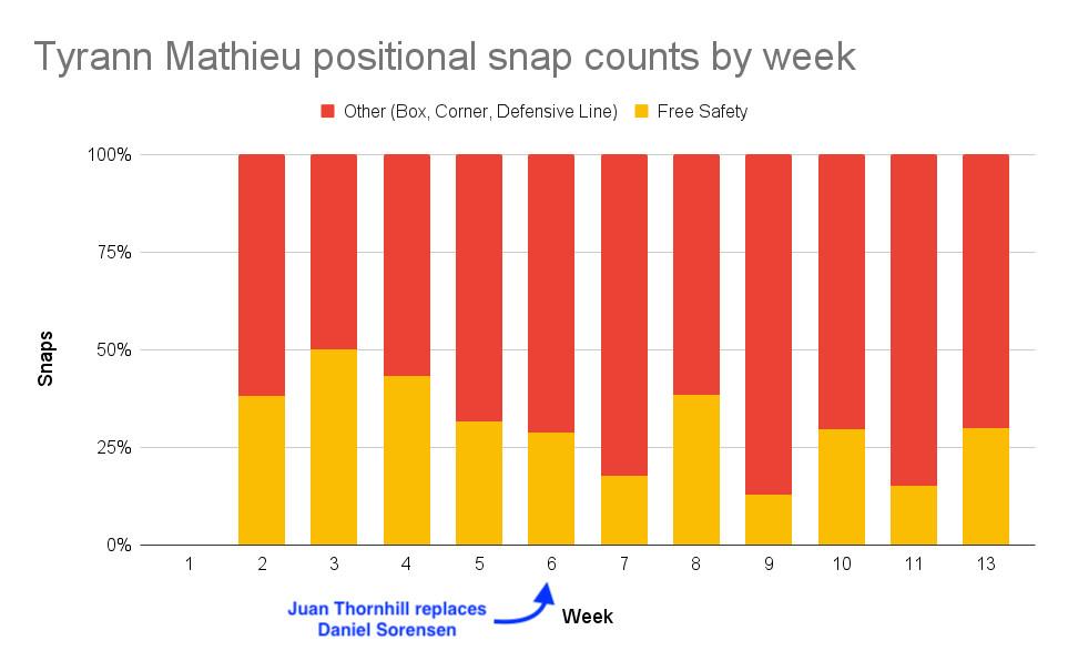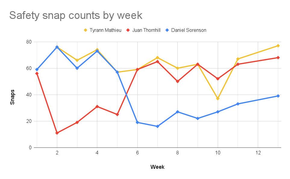 Regardless, the Chiefs had to do something about Sorensen, so Thornhill got the start over him in Week 6. Since then, Kansas City has never looked back. Sorensen has never come close to out-snapping Thornhill since and now operates almost exclusively as a dime linebacker who the Chiefs are slowly onboarding into his more situationally specific role.