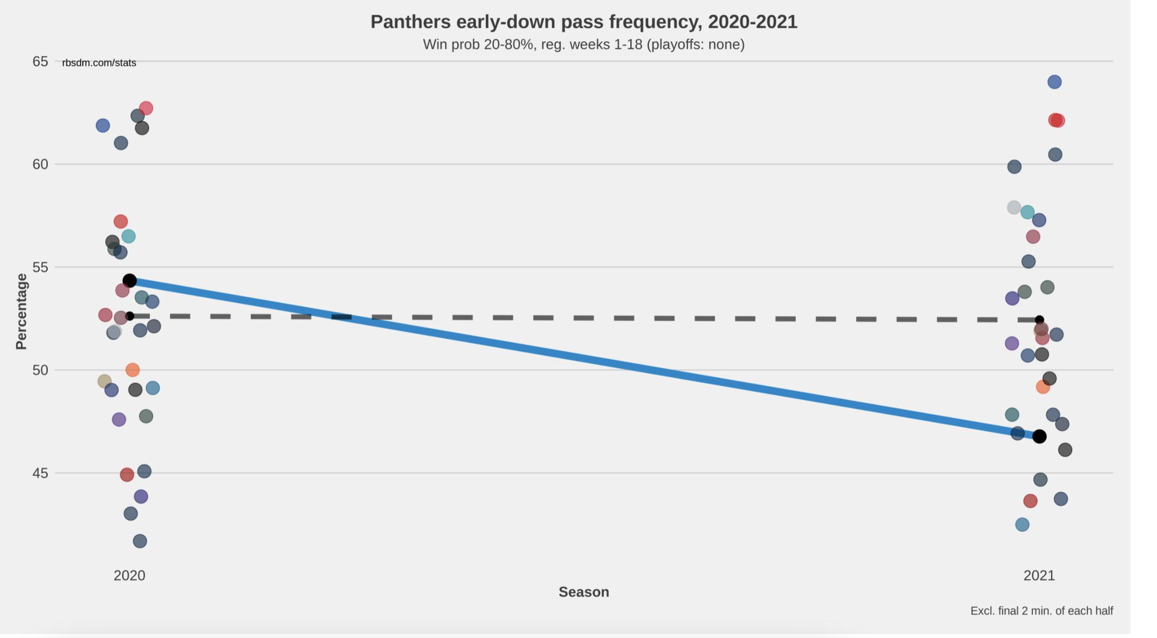 Rhule cited the Panthers’ low run rates as a major point of contention, which should set off alarm bells for anyone who has read even one statistical study of the sport over the past, I don’t know, 20 years? Rhule says he wants the Panthers running 30 to 33 times a game, but that’s hard to do when the team is constantly playing from behind. When filtering out garbage time, Carolina hovered around league average in pass rate last season and is well below the league average this season.