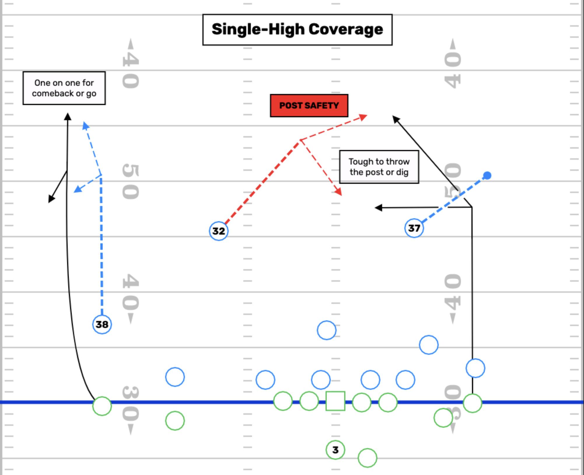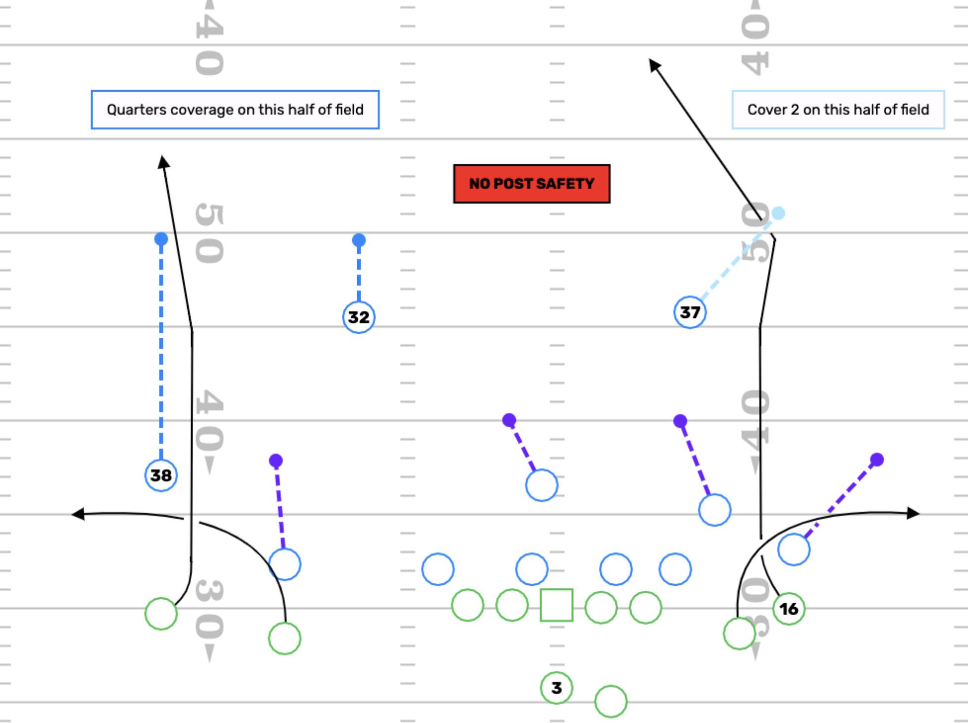 Remember, Carroll said there’s two ways to get a team out of two-high looks: run the ball on them, or beat them through the air. Wilson couldn’t do the latter last season: He ended the year 11th against single-high coverages and 27th against two-high coverages in EPA per dropback. This makes sense when we consider the throws Wilson likes, and the way the Seahawks built the offense around those tendencies in years past. Single-high defenses allow for deep vertical routes to develop against single coverage, as there is no deep safety helping the corner along the sideline—the only deep safety is tethered to the middle of the field. The deep safety’s positioning takes away the post and the dig, both of which are in-breaking routes that work toward the deep safety. That’s why a deep middle safety is often called a “post safety”—he’s there to take away the post.