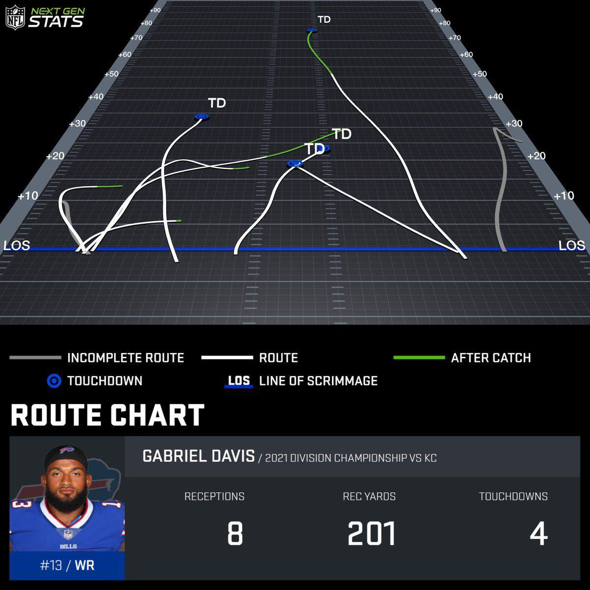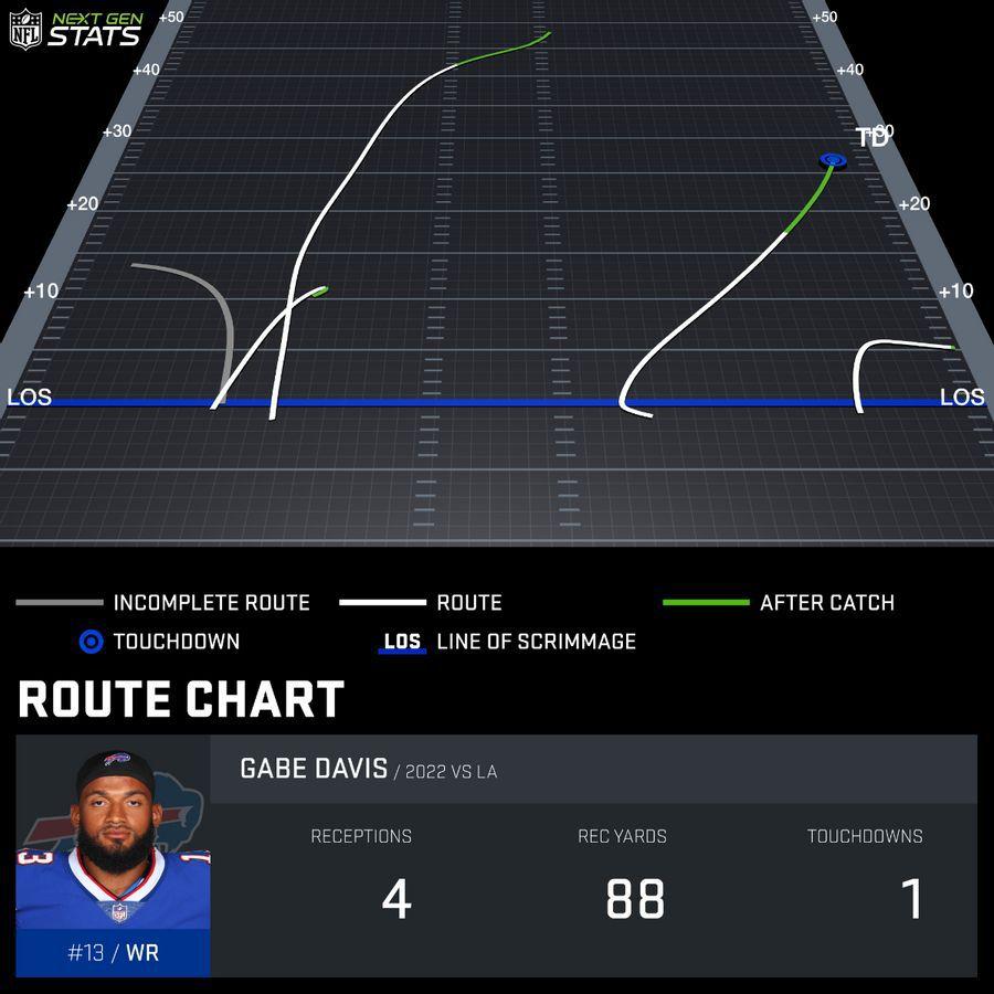Now take a look at the routes that Davis ran on those big gains. They’re all deep posts and vertical benders. Those routes became an indispensable weapon for Buffalo’s passing attack down the stretch of the 2021 season, and have remained as such this season. With opposing defenses selling out to stop deep crossing routes by Stefon Diggs—which had been a favorite of Allen’s during his breakout season in 2020—the Bills’ adjustment was to just throw even more deep routes. Instead of having the receiver break across the field horizontally, then-offensive-coordinator Brian Daboll put the cannon attached to Allen’s right shoulder to good use on vertical throws over the top. Davis, whose 4.5-second 40 time belies his ability to stretch the field at his size, might be the perfect receiver to run those routes. He’s a big fella who knows how to use that frame to box out undersized corners downfield.