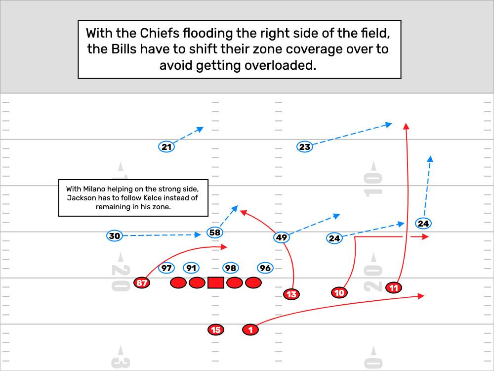 That clip is an example of Mahomes’s greatness, but it also serves as an example of Buffalo’s teamwork in coverage. Watch as they push their zone responsibilities to the right side of the field to counter Kansas City’s attempt to overload that area with four receivers.