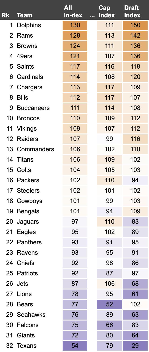 The premise of the All In-dex is simple: teams use money and draft picks to try to win championships. Teams score highly in the All In-dex by trading away future draft picks and spending money on their current rosters. Teams score low in the All In-dex by adding draft capital and saving money. For a full breakdown of our methodology, check out our original post from August. But the short version is that the All In-dex is a helpful tool to bucket franchises. Some teams are borrowing from their future to compete now, while others are stockpiling now to compete later—and a few are being pulled in two different directions.