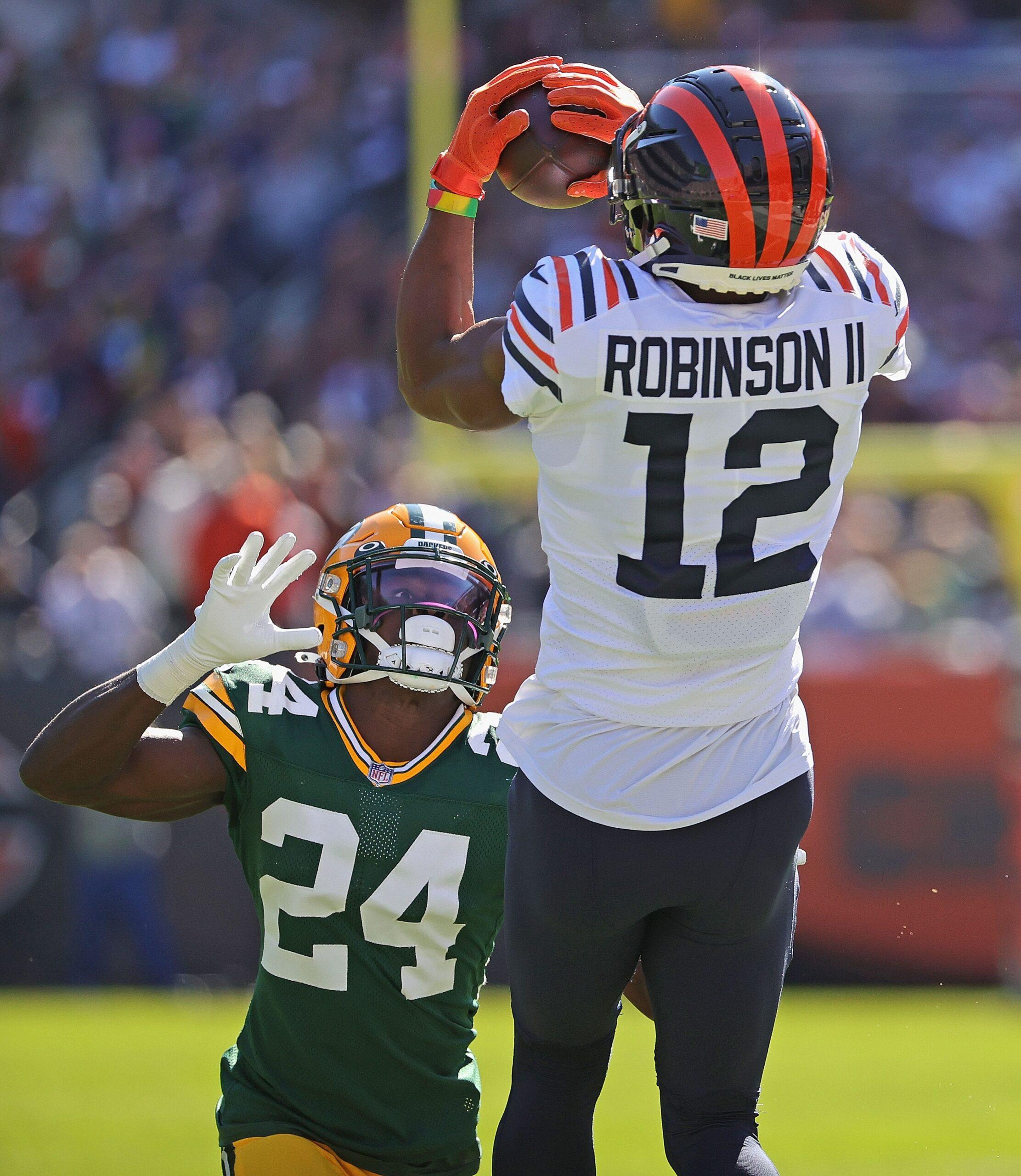 Robinson’s size—6-foot-2, 210 pounds—makes him desirable, as does his sure-handedness in open and contested situations. His career drop rate, per PFF, is 5 percent, and he logged 67 contested catches in his four seasons with the Bears. But beyond the physical tools, he’s impressed his coaches with his curiosity about the scheme and his attention to detail in the film room.