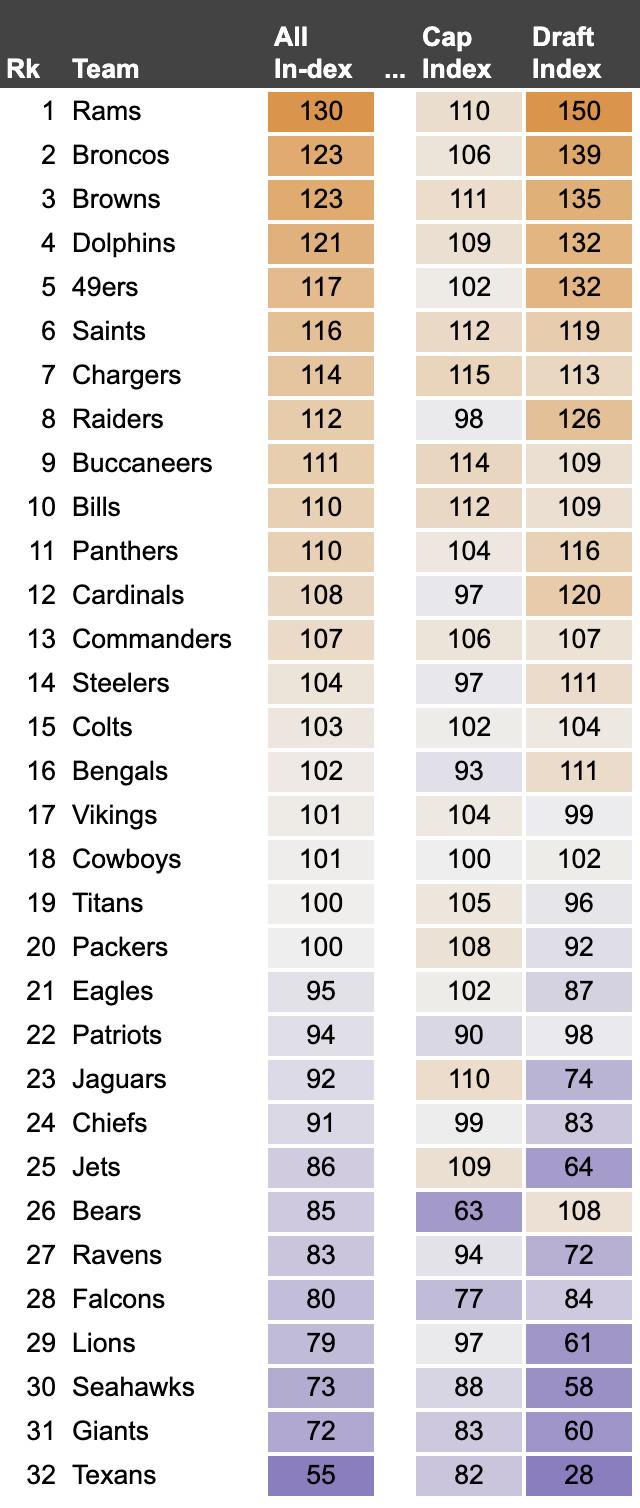 How fitting that the team with Kirk Cousins registers a 101 on the All In-dex—exactly one point above average. Minnesota is in transition after the long tenure of former coach Mike Zimmer and GM Rick Spielman, and new GM Kwesi Adofo-Mensah has committed to Cousins for only two more seasons. Minnesota is flexible enough to go in whatever direction it wants.