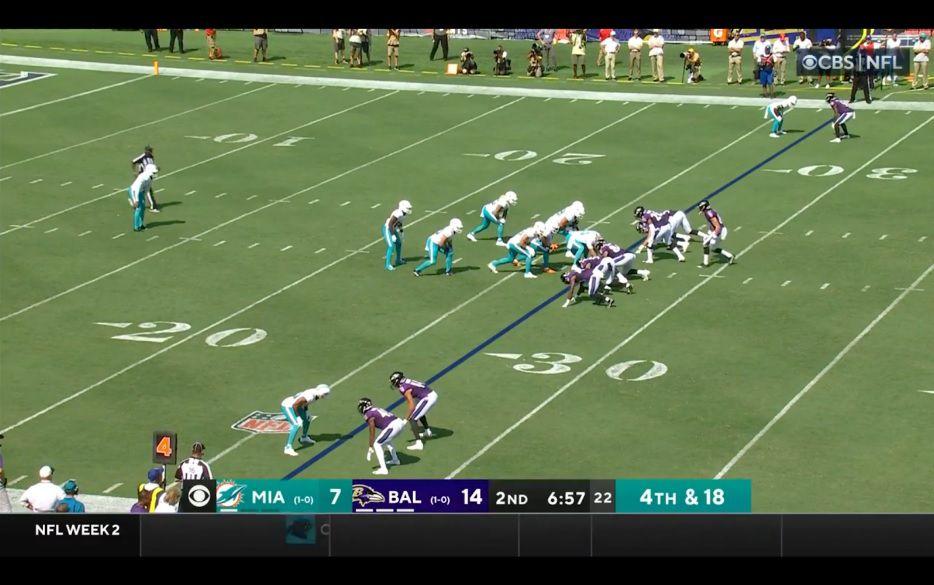 You’ll see the line of scrimmage is the 27, but the punter, Thomas Morstead, is 14 yards behind the line. Miami’s blockers are a solid 10 yards clear of Morstead, giving him clean, unimpeded space to operate. Because the punter is so far back, the punt team doesn’t need to do a perfect job blocking. If the blockers even mildly inconvenience the opposing rush, they probably won’t get 14 yards downfield in time to block the kick. And Miami has gunners on both sides of the field who don’t even worry about protecting Morstead—they’re mainly focused on getting downfield and covering the punt, preventing a long return.