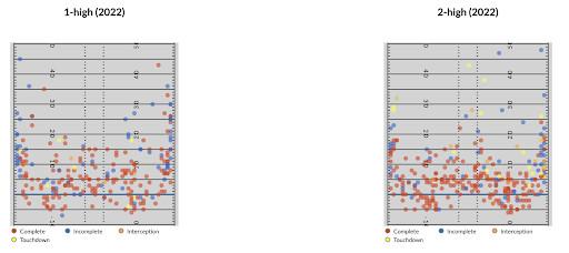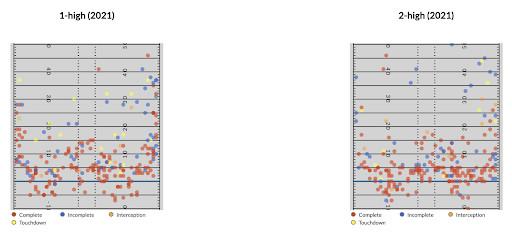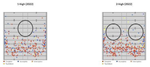 So what were the issues for the Bengals offense against two-high last season? We can take a look at Burrow’s target distribution in 2021 to understand part of the problem. Here are all the passes Burrow threw in 2021, as provided by TruMedia, separated by the coverages he faced. There are some slight differences in density—against two-high coverages, Burrow certainly threw underneath more often and downfield less frequently. But in general, where he threw the football didn’t change much.
