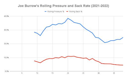 Here’s Burrow’s sack rate by game in each of the last two seasons, with a rolling average of the last 10 games charted along with it.