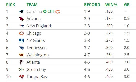 There are some key games approaching. The Giants play the Patriots next week in a game that will likely decide who gets a Williams/Maye pick and who doesn’t. The Cardinals play the Bears in Week 16, when the picture will be more clear. And the one-win Carolina Panthers—living proof that the first pick won’t magically solve all your problems—have the Titans, Buccaneers, Falcons, and Buccaneers again on their remaining schedule. All teams currently in the bottom 10 for draft positioning.