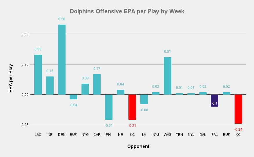 The Miami Dolphins led the league in pre-snap motion rate—they were the only team in the league to send a player in motion on more than 80 percent of their offensive plays. Here’s their EPA per play by game this season, with their games against the Ravens and Chiefs highlighted.